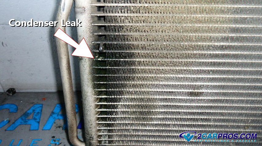3. The AC condenser is positioned at the front of the vehicle and is subject to small rocks and other road debris which can easily damaged the unit and cause a leak. Check the entire condenser including the hose connections.