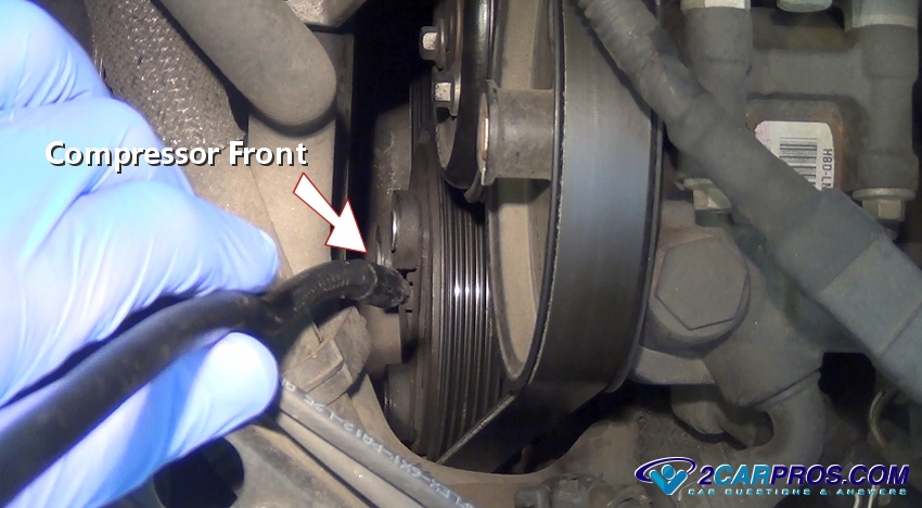 4 . The front of the compressor is where the main shaft seal is located and a very popular place for a refrigerant leak. Position the sniffer in the very front of the compressor, and at the lower part of the clutch or pulley.