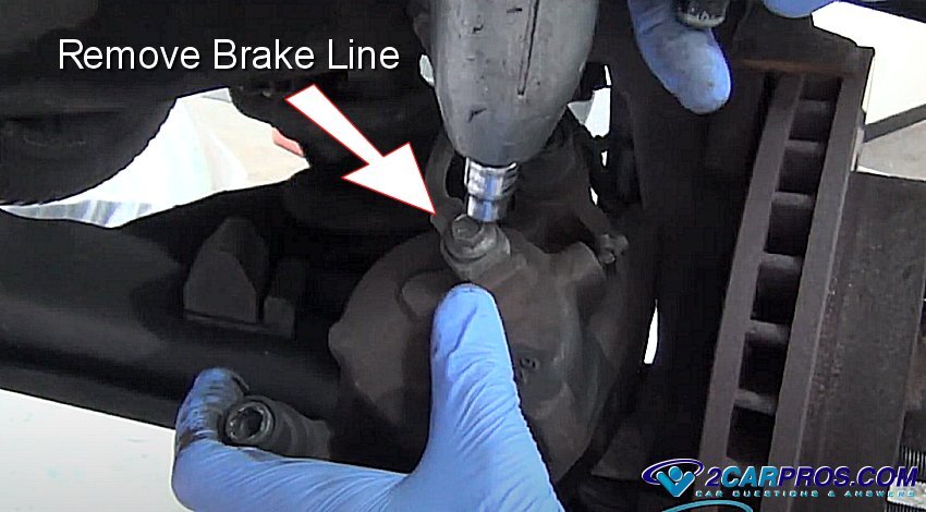 2. Remove the hydraulic brake line from the brake caliper, when this is done brake fluid will run out of the brake line which must be stopped. The preferred method is to remove the brake flex hose from the frame brake line and use a rubber cap to plug it off, an alternative method is to gently use a pair of vise grips with a rubber hose covers on each jaw and gently pinch the rubber brake hose off. Or you can work quickly to replace the brake caliper before the brake master cylinder runs out of fluid which will cause brake bleeding problems.