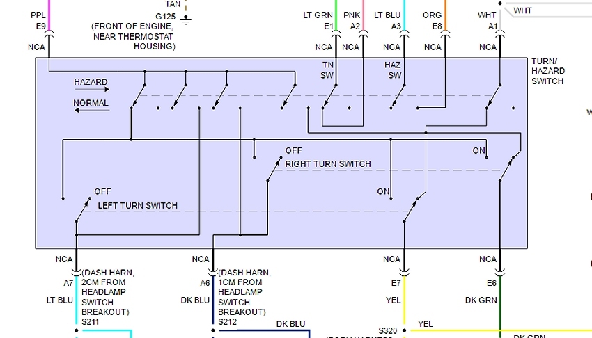 Here is a typical wiring diagram for a system which powers through a turn signal switch. Again YEL (E7) and DK GRN (E6) probe these wires while holding down the brake pedal. They should have power and if not the switch is bad and needs replacement. You can get a wiring diagram for your car by asking one of our experts for free.