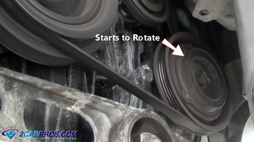3. Locate the AC compressor which is located on the lower right or lower left front of the engine in most cases. Have a helper start the engine, and turn the AC system on full cold while you observe the compressor clutch. It should "click in" letting you know the compressor is engaged. If when you turn the air conditioner on there is a loud screeching noise or a rattling sound shut the system off because the compressor needs to be replaced.
