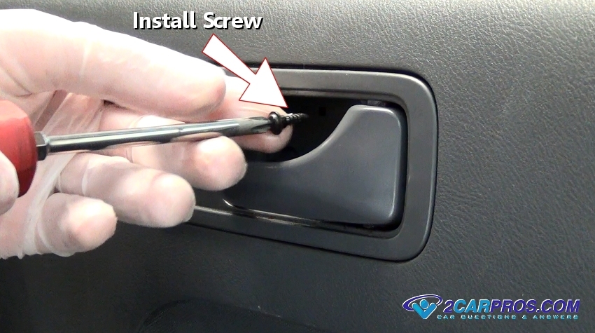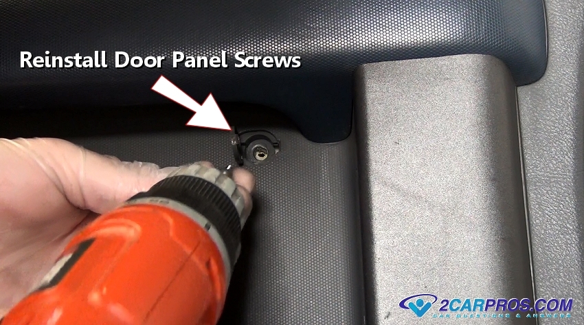 Reinstall all door panel screws or bolts and recover them with the small hidden plastic panels or doors.