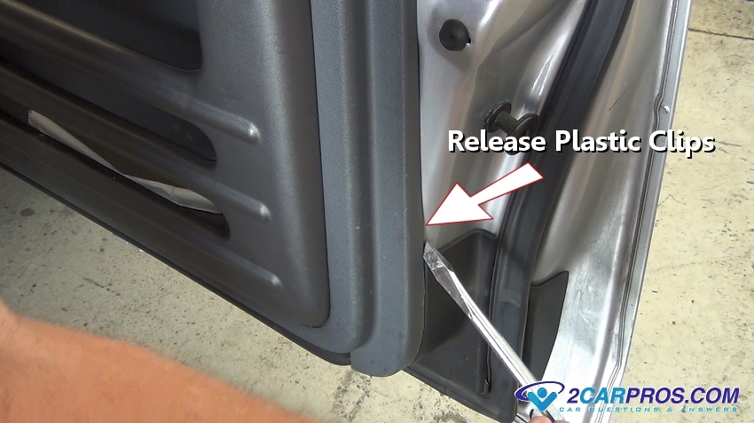 Use a screwdriver or door panel removal tool and wedge it in-between the panel and the door. This will release (pop) the plastic clips holding the panel to the door. Follow this action around the bottom of the door until completely released.