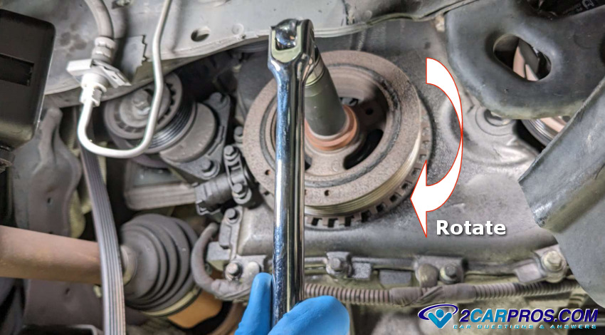 - Connect a breaker bar which is a long bar socket wrench for leverage and turn the engine clockwise only. You don't want to turn the engine backwards because the timing chain tensioner can retract and the engine may jump time.