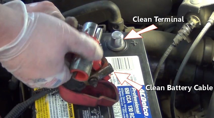 4. Use a wiring brush or a battery cleaning tool which you can get from Amazon for about $5.00 (US) and work it into the battery cable end to remove all corrosion. Also clean the adjacent battery terminal as well.