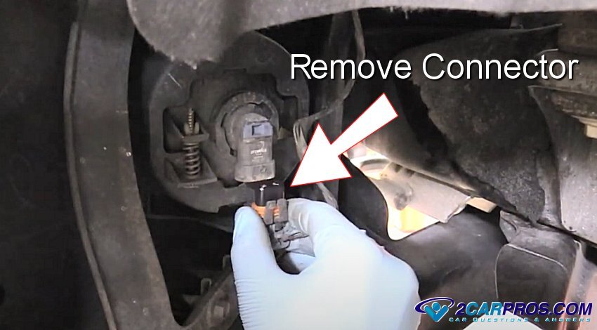 1. Once the car or truck is safely raised up, turn the front wheels to gain access to the rear of the fog light fixture, some vehicles will need to have the inner fender liner removed. Next, locate the bulb wiring connector and discounted it, this will have a clip safety that will need to be released. Avoid pulling on the wires directly to prevent damage.