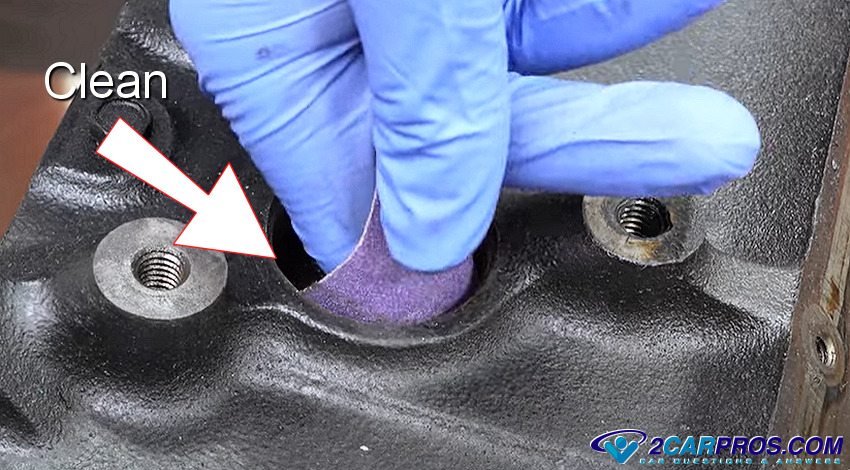 4. Clean Hole: You must clean out any rust or corrosion from the freeze plug hole to ensure a proper seal when the new freeze plug is installed. Clean the hole walls using emery cloth or sand paper until smooth.