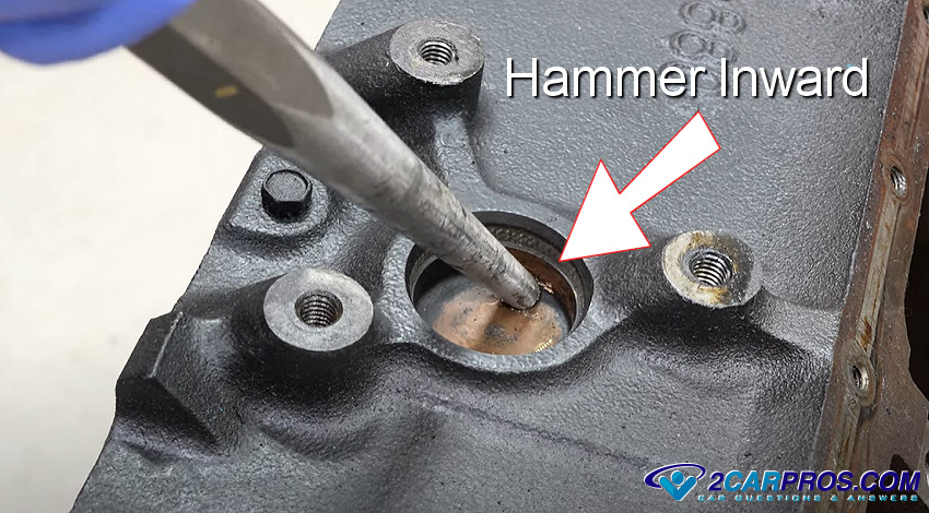 1. Push Freeze Plug Inward: Once you have disassembled and removed any obstructions that hinder the freeze plug service, use a large punch and hammer to force the freeze plug inward. Do not "score" the engine block during removal or it will cause a leak for the new soft plug.