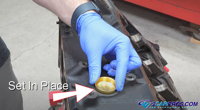 6. Set in Place: We prefer to apply a thin layer of RTV silicone to the edges of the plug for added sealing which is applied before installation. Remove the freeze plug from the freezer and push it into place, it should stay.