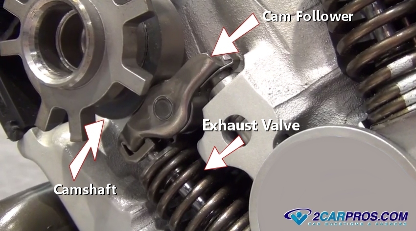 Here we show an overhead cam set up with the cylinder head and block cutaway, the lifters are directly over the valve spring with four valves per cylinder, two intake and two exhaust. On four valve set ups, the valves are slightly smaller in size but may allow more air flow than one larger valve.