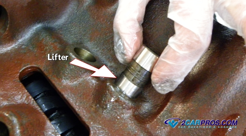 In this configuration the lifter rides inside a lifter bore which is located in the engine block itself. Roller lifters are exactly as the name implies, they are designed with a roller wheel and needle bearings that ride along the camshaft which reduces drag. A lifter can also be called a tappet, this picture shows the lifter being removed from the top side of the engine block.