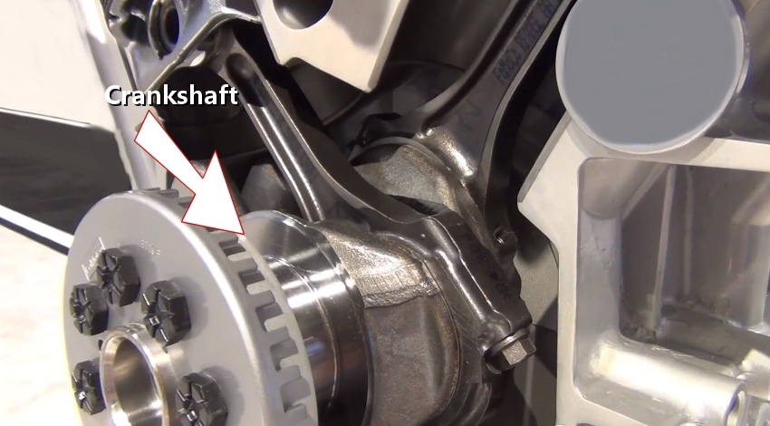In this image we show how the piston is attached to the crankshaft using a piston or connecting rod. This rod has a cap located at the bottom of the rod which splits into two pieces so it can be bolted to the crankshaft using two rod bolts. (It is difficult to see the line where the rod cap separates.) This is were the rod bearing is located which allows the crankshaft to turn while being oiled by the oil pump and oiling system. At the top of the rod there is a wrist pin that is located through the piston and can pivot near the bottom of the piston body.