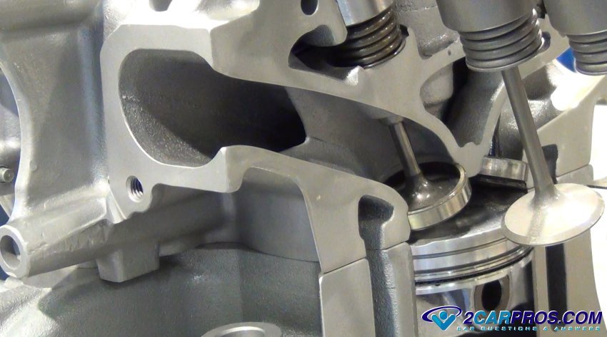 Here is a cutaway of a cylinder head which shows the intake and exhaust ports which are controlled by the valve in each port. These valves seal the combustion chamber so when the piston is travelling upward it can create compression for the combustion process.