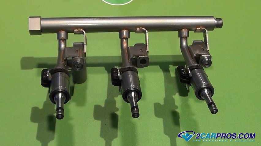 A fuel injector is used to control and meter the amount of fuel that enters the engine at any given time. While the engine is under load and more power is needed a command for more fuel is given by the car's computer (PCM). The fuel injector is part of the fuel injection system. In the image below there is a set of direct injection fuel injectors which spray fuel directly into the combustion chamber near the time of ignition unlike the traditional fuel injectors which spray into the intake port just behind the intake valve.