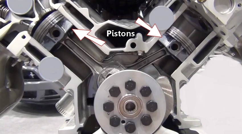 Here is a cutaway image of a V8 engine that shows how the pistons are attached to the crankshaft which rotates inside of the engine block along with the cylinder heads bolted to the top of the block deck. A straight six, five or four cylinder has just one cylinder head.