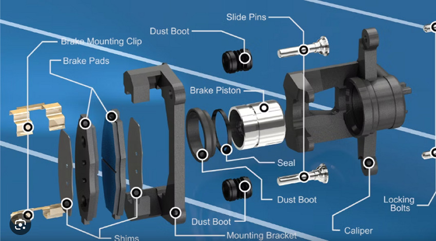 - Caliper Housing: The main body that holds the other components. It is typically made of cast iron or aluminum.