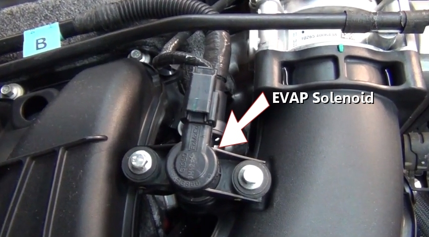 An EVAP solenoid is controlled by the main engine computer and located near the intake manifold. This solenoid is connected to the charcoal canister using a vacuum hose to draw raw gas vapor from the fuel tank and into the charcoal canister.