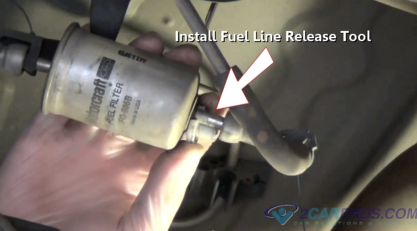 It's a good idea to use rubber/vinyl gloves and safety goggles when working with fuel. Inside the fuel system there can be residual pressure which will be relieved when disconnecting the fuel pressure line from the filter. Be ready to control dripping fuel with a small container and/or shop towels.