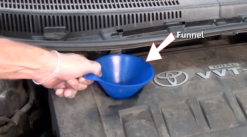 Install an oil funnel to assist the motor oil installation to avoid spillage. Make sure the inside of the funnel is free of dirt because you don't want added debris to enter the engine while you are pouring the clean oil in.