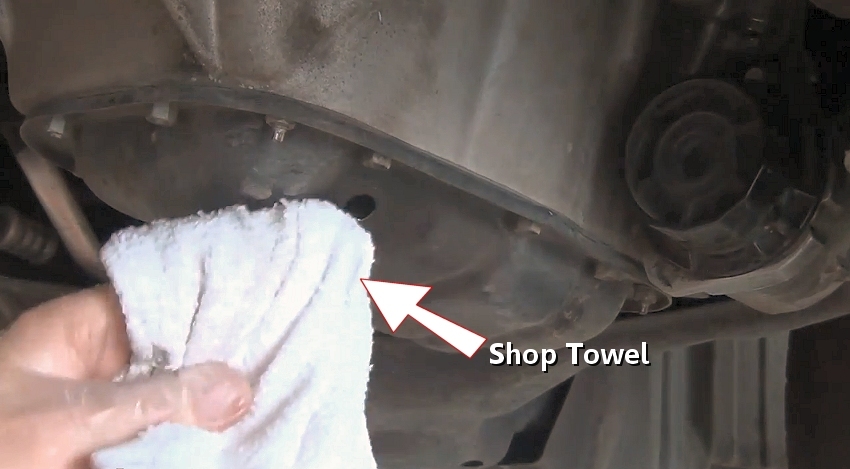 Use a shop towel to wipe clean the drain plug area. This will make it easier to see if the seal has a leak once the job is complete.