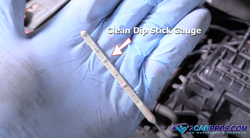 Remove the dipstick and wipe clean using a paper or shop towel, typically a dipstick