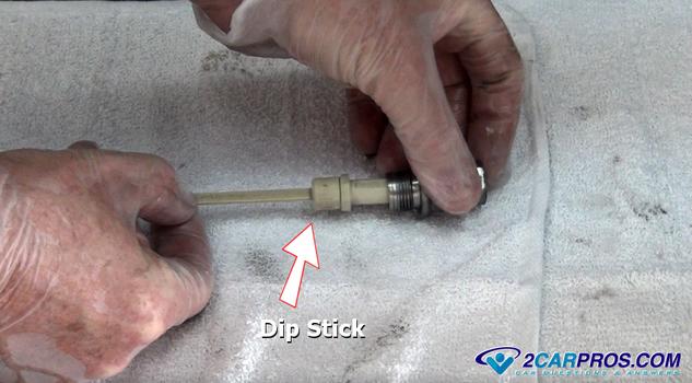 and pull it back out again. This will show the level of the fluid inside the transmission.