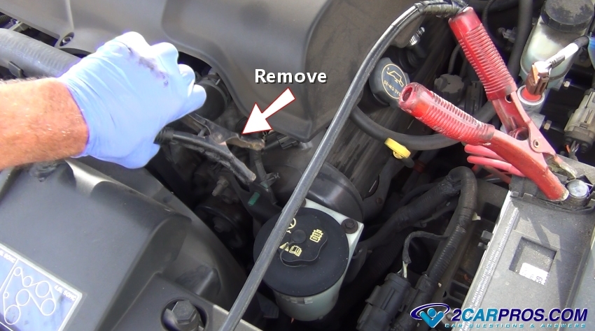 7. Connect Negative Jumper to Engine Ground Only: The final connection of the jumper cables will be to an engine ground only. The reason for this is because the final connection will make some minor sparks which can ignite hydrogen gasses inside the battery. For safety proposes find a metal bracket or bolt and make the final connection for the jumper cables. Wiggle the clamp to ensure a good connection, also you want to be sure the cables and clamps are clear from rotating engine parts such as the fan blade or serpentine belt.