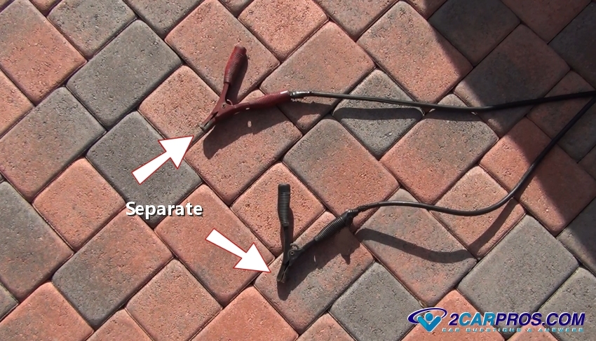 3. Separate Jumper Clamps: You will be connecting the jumpers to the car with the dead battery first, the opposite end of the cables must be separated. If these ends are touching when you connect the jumpers to the dead battery there will be a short circuit and sparks which can cause the battery to explode. We don't mean to scare you, but inside the battery there are hydrogen gasses which a spark can ignite. It doesn't happen very often but it does happen.
