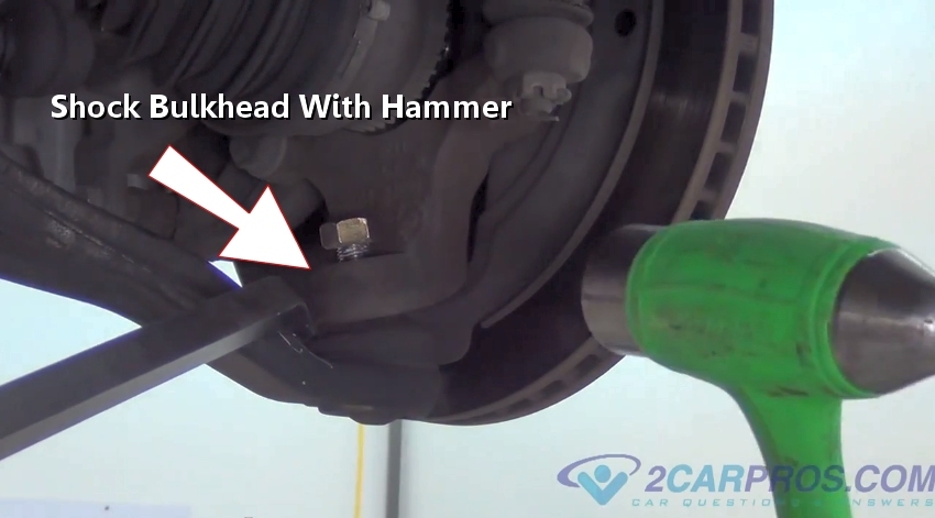 4. While applying force downward strike the lower control arm bulkhead to release the ball joint taper. This will take more than one hammer strike to get the ball joint to release in most cases. If you have trouble with this step have a helper apply additional pressure on the pry bar while using a larger hammer to make the strikes. This will "shock" the joint loose and you should feel a pop when the joint releases.