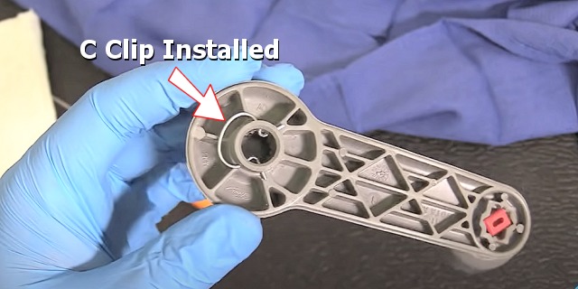 Now, insert a shop towel between the window crank and the plastic washer as in