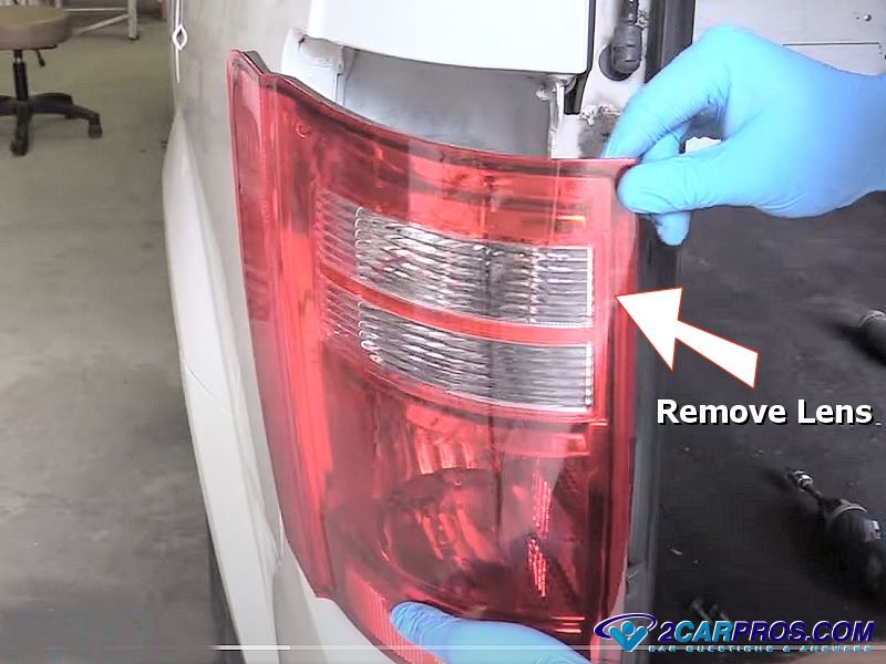 2. There are two types of brake light bulb service arrangements, either you can gain access to the bulb from the rear of the lens, or you will need to remove the lens to be able to service all of bulbs, such as the reverse, brake and running light bulbs. To start, remove the lens mounting screws after opening the lift gate, tailgate, hatch, or trunk lid.