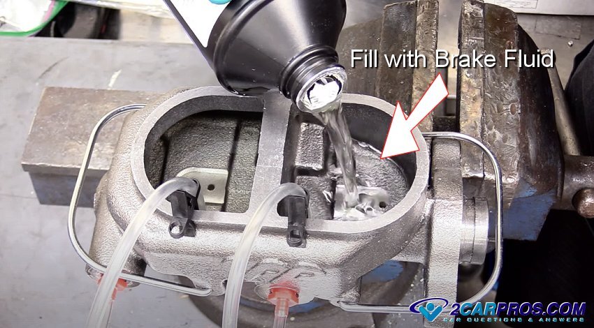 2. Make sure the brake bleed tubes are down inside the fluid reservoir and fill the brake master with brake fluid to just under the full line. The idea is you don't want these tubes to suck air in when working the master cylinder's plunger.
