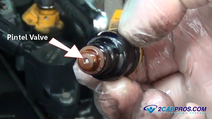 The pintel valve located at the end of the injector is where the fuel exits the injector and enters the engine, its common for these valves to plug and stop working (small holes.)