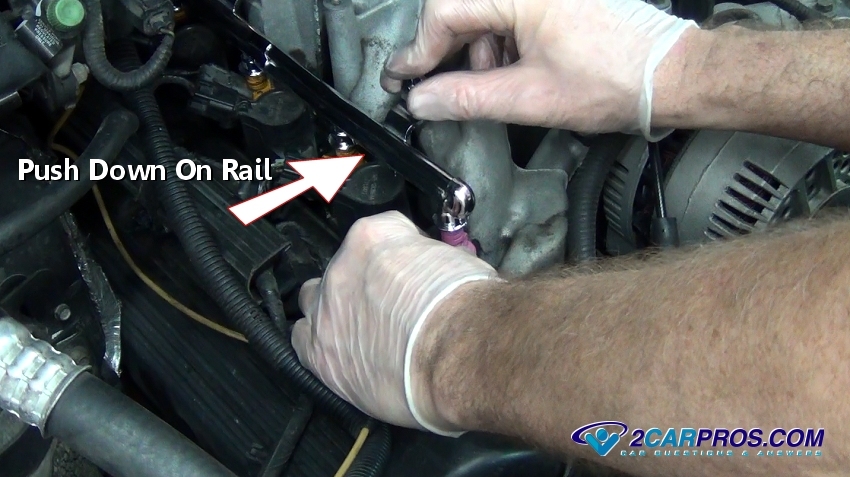 Apply pressure downward to the fuel injector from the rail, this will release the injector from the O ring seal located on either end of the injector. (Note: Some injectors are held in by a retainer clip that must be removed.)