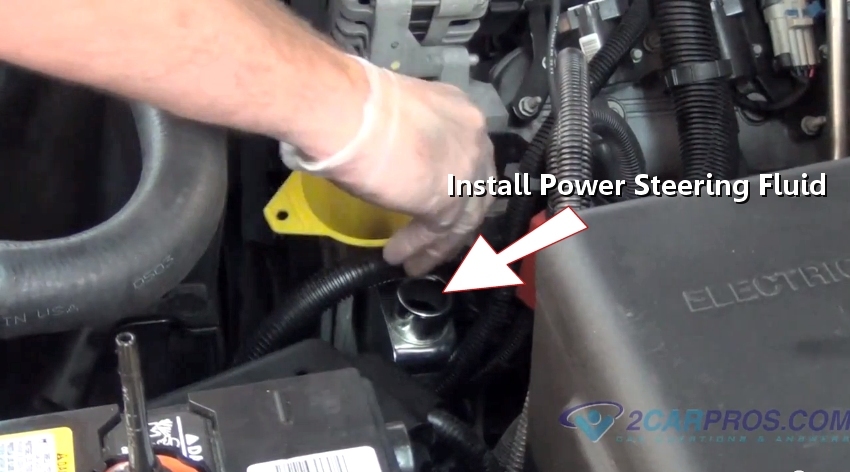 the pump reservoir cap and refill with power steering fluid.