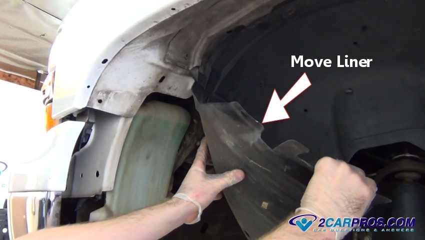 Release and remove the plastic fasteners holding the fender liner in place. Move