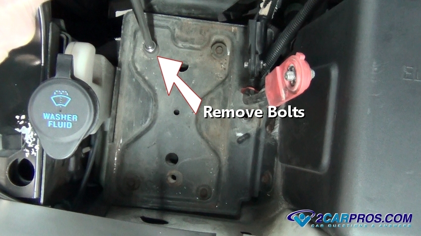 Use a socket to remove the battery tray mounting bolts and then lift the tray