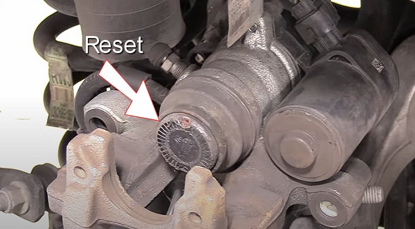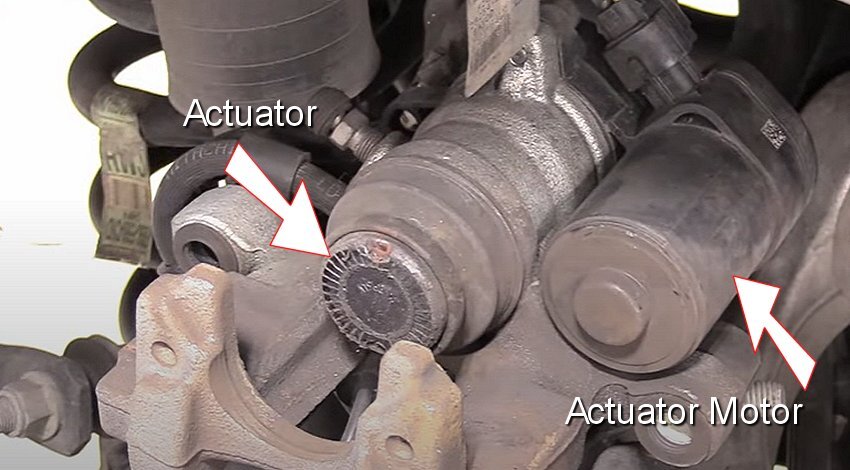 2. After removing the wheel the brake caliper will be exposed, at this point perform a normal rear brake job service but stop at installing the new rear brake pads. Now, you will need to do the brake caliper reset procedure before the rear brake pads are installed. In the image below you can see the actuator itself and the actuator activation motor.