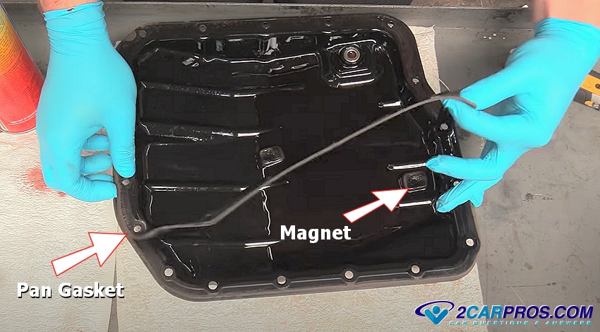Before reinstalling transmission pan clean the gasket sealing surface with a