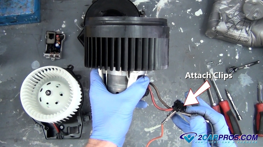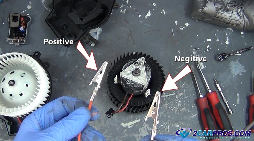8. While grasping the motor firmly, attach the power and negative wiring clips to the blower motor wiring harness. If the blower motor only has a power lead attach the ground wire to the frame of the motor. Once the circuit is completed the motor will spin or will not confirming the blower motor failure. A blower motor typically fails intermittently, if the blower fan is not working and the vehicle hits a bump while driving and the blower starts up again the brushes inside the motor have worn out in most cases. Please Visit: Blower Fan Motor Failure Symptoms