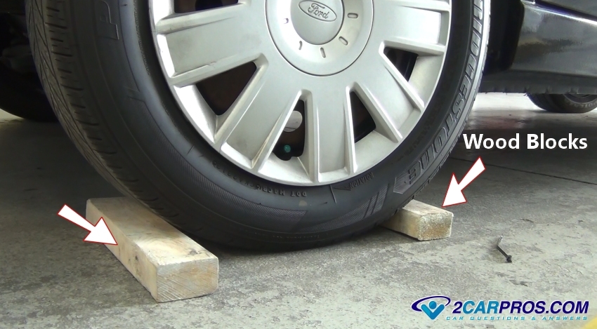 Before you begin raising your vehicle you must install wood blocks to the wheels