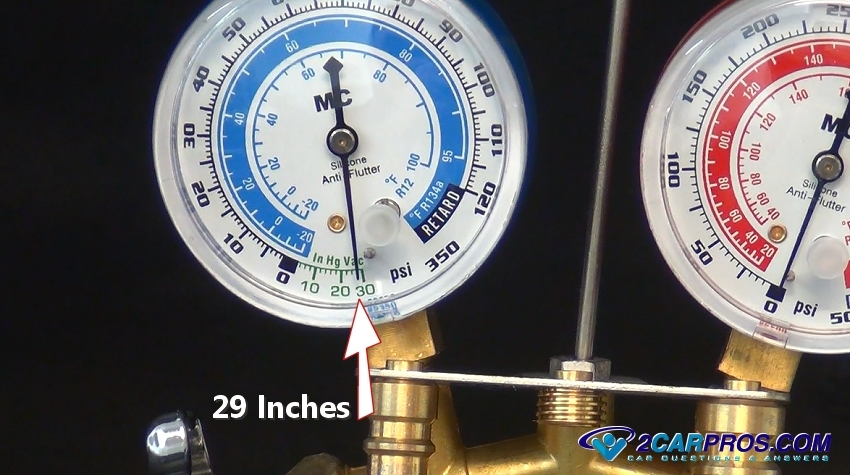 Once the vacuum pump has been on for about 30 minutes close the low side valve and turn the pump off. The system should hold at 28-29 inches of vacuum. If the system never reaches 28-29 inches there is a large leak, if the system loses vacuum after 15 minutes there is a small leak and the system must be rechecked.