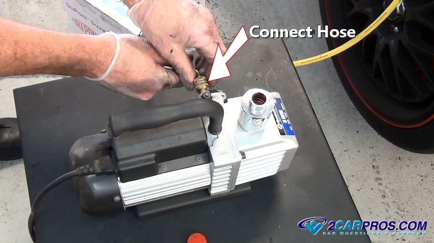 When repairs are complete, or if you are performing a full air conditioner service connect the center hose from the gauge set (yellow) to the vacuum pump and turn the unit on, you will hear a gurgling noise which is normal. This step removes any moisture and static air from inside the system.