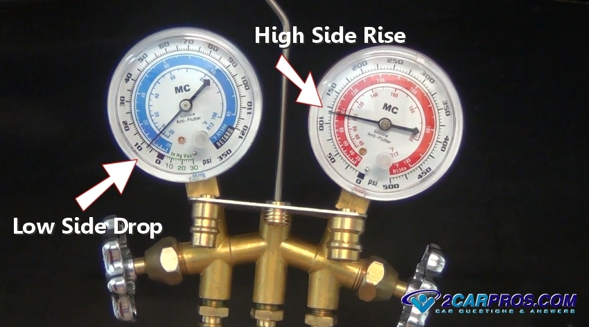 The high side pressure will steadily start to rise. Have a helper raise the engine idle slightly, and to use a garden hose to spray water over the condenser at the front of the vehicle to help cool it down (simulated air flow).