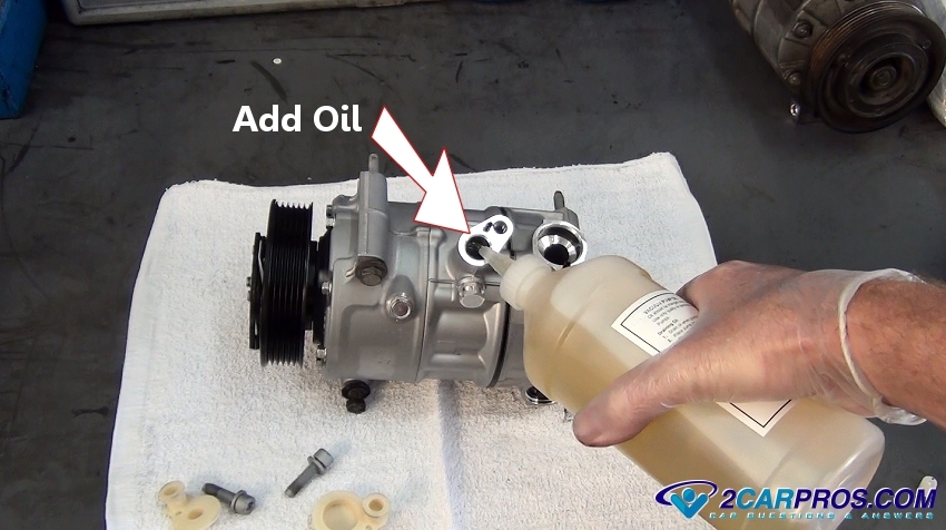 Though the system has PAG oil throughout its internal workings and is usually including in the new compressor, it's a good idea to drain the new compressor of and then add new oil to ensure proper lubrication before installation, then reinstall dust caps. Some units have the correct amount of oil already installed, be sure to read the installation tag which is supplied with the replacement unit.
