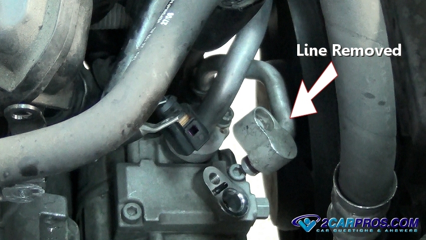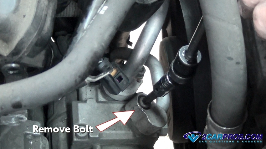 Locate and remove the high and low side refrigerant line mounting bolts or flare nuts depending on the manufacturer's design. Again, on some models this step may need to be performed after the mounting bolts have been removed and the compressor is loose.