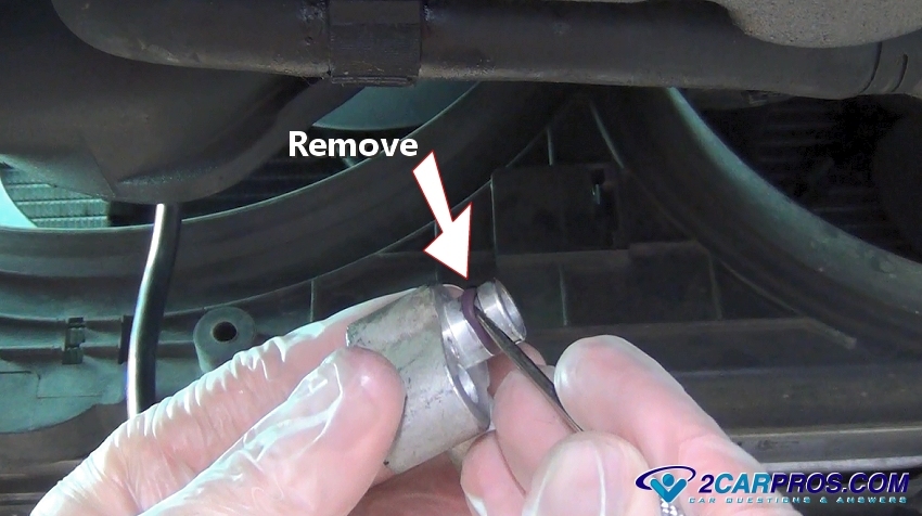 O rings are used to seal the high and low side lines to the compressor housing. These sealing surfaces must be clean and free from dirt or damage to keep them from leaking. Use a small screwdriver or pick to carefully remove the old O ring seals from both the high and low side lines without scoring the sealing surfaces.