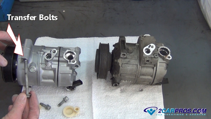 When installing the new compressor into the engine bay it's a good idea to transfer some of the mounting bolts from the old unit to the new one before lowering or raising it into the engine bay, this will help for an easier installation.
