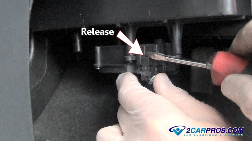 6. Once released gently pull down on the wiring connector and remove it from the blend door actuator. Inspect the connector for rust or corrosion and clean as needed.
