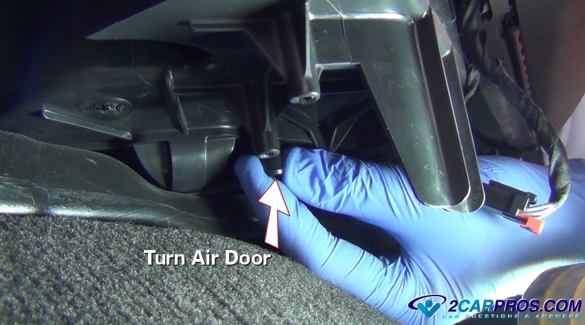 9. Before installing the new actuator it's a good idea to manually turn the blend door in both directions to ensure it is not stuck which will cause the new actuator to fail. Grasp the door pivot and move it back and forth to its full travel, it should move freely. If you cannot move the blend door an obstruction has gotten in the way of the door movement. These obstructions include: pen, tooth pick, small toy or bubble gum to name a few. If the door is stuck the heater plenum with need to be removed and the problem resolved before installing the new unit.